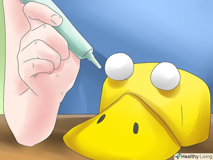 Прикріпіть застібку липучку до качиних лап і своїх шкарпеток.Одну половину застібки необхідно приліпити з нижньої сторони качиної лапи приблизно посередині, а другу – до помаранчевого носка в точці дотику з першою половиною застібки на лапі.- При підборі шкарпеток для костюма пошукайте ті, які будуть на розмір більше звичайного або досить просторими. Повинна бути можливість натягнути шкарпетки на черевики.