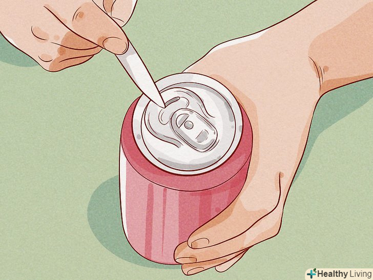 Виконайте ножем невеликий отвір вгорі банки, щоб через нього надходило повітря.розташуйте ніж вертикально і приставте його кінчик до верхньої частини банки поруч з язичком. При цьому міцно утримуйте і банку, і ніж. Злегка натисніть ножем на банку, щоб проткнути її. Простежте, щоб краї отвору не мали гострих зазубрин, інакше ви можете порізатися, коли будете пити пиво.[7]- Можна проткнути банку ножем, ключем або іншим гострим предметом.