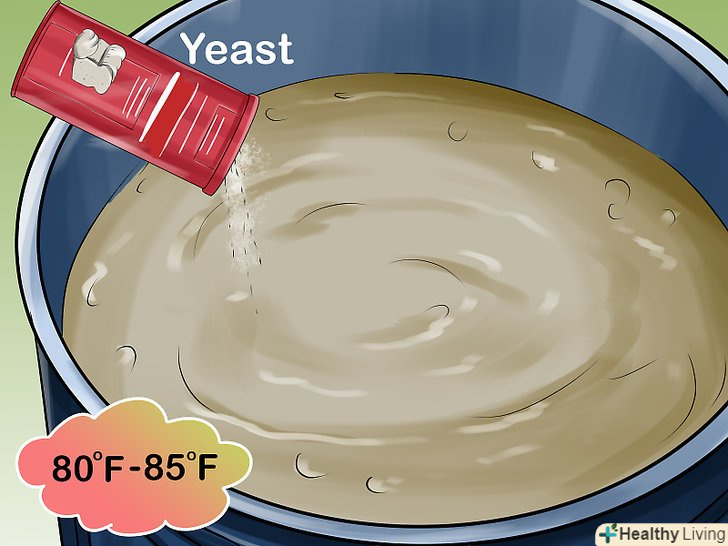 Додайте в бродить середу дріжджі.активуйте необхідну кількість сухих спиртових або інших дріжджів і додайте їх в рідину. Перемішайте рідину чистою стерилізованою ложкою, щоб дріжджі рівномірно розподілилися в ній. Якщо ви використовуєте повітряний затвор, при активному бродінні з нього будуть виходити бульбашки. Утворення бульбашок газу різко сповільниться або взагалі припиниться після того, як процес бродіння завершиться.[12]- Тримайте бродячу рідину в приміщенні з температурою 27-29 °C, щоб полегшити процес бродіння і зробити його більш ефективним. Якщо в приміщенні холодніше, можна використовувати гріючий пояс.