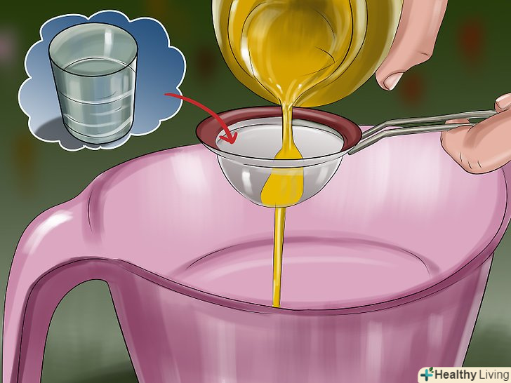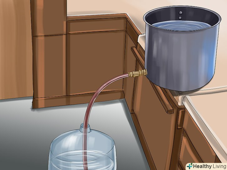 Процідіть сусло або іншу рідину в посудину для бродіння.якщо ви приготували сусло, процідіть його через дрібне сито в очищений і стерилізований посудину для бродіння. Постарайтеся при цьому трохи розплескувати рідина і лийте її з деякої висоти, щоб вона наситилася повітрям.[11]- Спочатку дріжджів потрібно повітря (кисень), щоб приступити до розмноження і бродіння. Це пояснюється тим, що дріжджі виробляють з кисню клітинний матеріал у вигляді ліпідів. Однак після початкової стадії бродіння кисень небажаний, так як в його відсутність дріжджі виробляють спирт.
