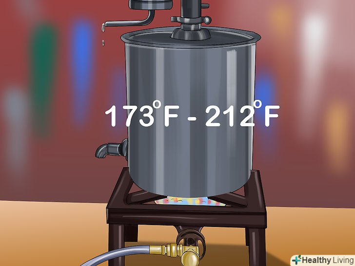 Спробуйте використовувати пшеничне сусло.Візьміть металеву каструлю з кришкою на 40 літрів і розігрійте в ній 25 літрів води приблизно до 75 °C. додайте 8 літрів сухих пшеничних пластівців і перемішайте. Перевірте, щоб температура була між 65 і 68 °C. додайте 4 літри меленого пшеничного солоду. Після цього температура не повинна опуститися нижче 65 °C. накрийте каструлю і підтримуйте потрібну температуру півтори-дві години. Час від часу помішуйте сусло.[6]- За цей час крохмаль повинен перетворитися в зброджуваний цукор, і суміш стане набагато менш в'язкою.