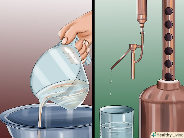 Зберіть решту дистильованої рідини.після того як ви зіллєте первач, конденсована рідина буде містити потрібний вам спирт (етанол), а також деяку кількість води та інших речовин. Цю частину називають "тілом". Якщо ви використовуєте колонний апарат з проточною холодною водою, на даному етапі можна регулювати потік води, щоб контролювати вихід і чистоту дистиляту.[20]- Розраховуйте отримувати 2-3 чайні ложки (10-15 мілілітрів) дистиляту в хвилину. Збільшення виходу дистиляту знижує його чистоту.