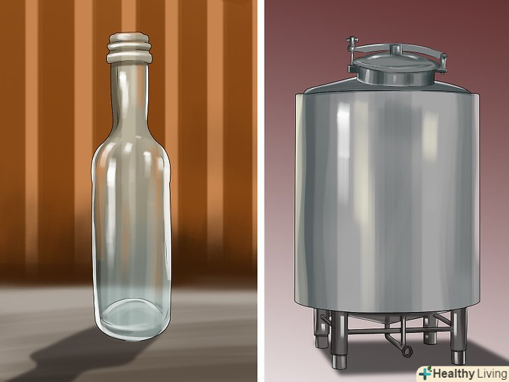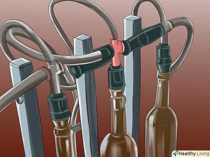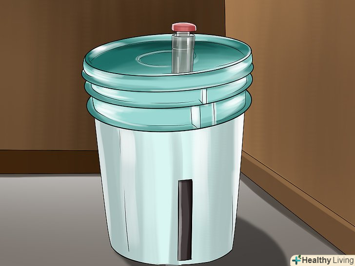 Виберіть і встановіть повітряний затвор.такий затвор являє собою пристрій, який випускає з ємності вуглекислий газ CO2, але при цьому не дає проникнути в неї кисню O2. Для бродіння 20 літрів процідженого сусла досить харчового відра об'ємом 30 літрів або 25-літрової бутлі. Відро можна закрити кришкою, а бутель — гумовою пробкою, проте ні в якому разі не закривайте їх наглухо, інакше в них створиться надлишковий тиск вуглекислого газу, і їх може розірвати.[10]- Обов'язково приєднайте до кришки або пробці повітряний затвор, щоб посудина не розірвало через надлишкового тиску.