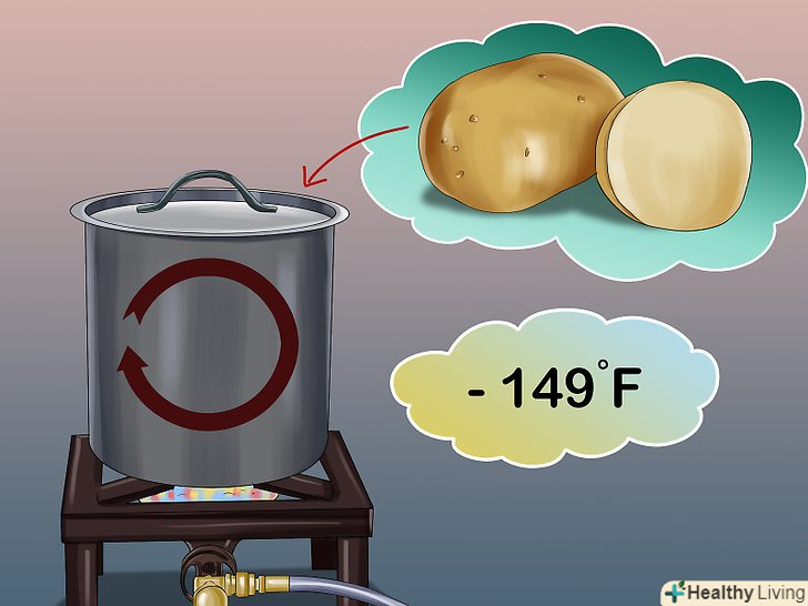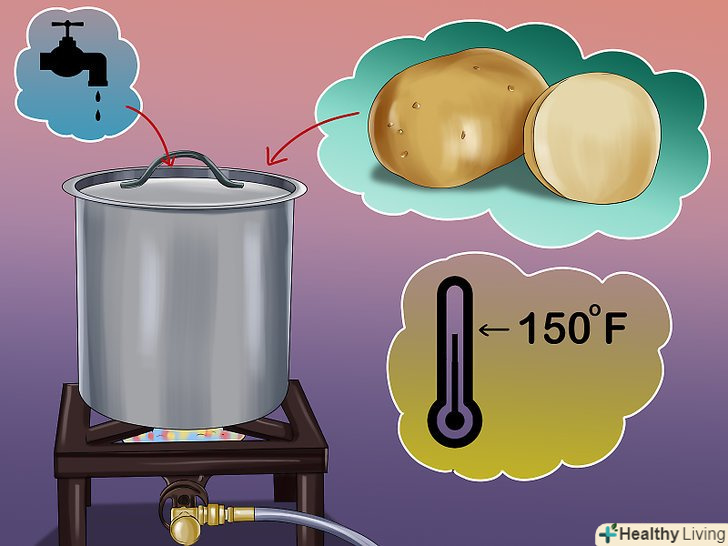 Приготуйте картопляне сусло.почистіть 9 кілограмів картоплі. Приблизно протягом однієї години варіть очищений від шкірки картопля у великій каструлі, поки він не розм'якне. Злийте зайву воду і як слід пам'ятайте картопля вручну або в кухонному комбайні. Перекладіть картопляне пюре назад в каструлю і додайте 19-23 літри води з-під крана. Перемішайте вміст каструлі і розігрійте його ненабагато вище 65 °C.[7]- Додайте 1 кілограм меленого солодженого ячменю або пшениці і як слід перемішайте. Накрийте каструлю, час від часу помішуйте сусло і розігрівайте його протягом 2 годин. Потім вимкніть вогонь і залиште суміш на ніч, щоб вона охолола до 27-29 °C.