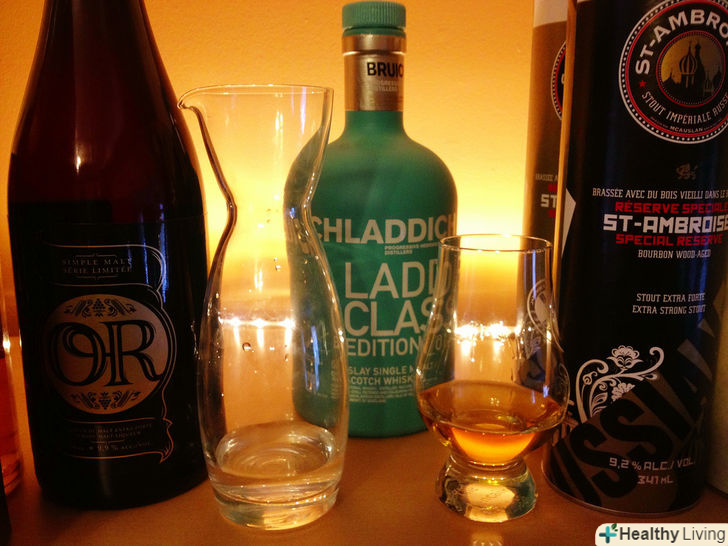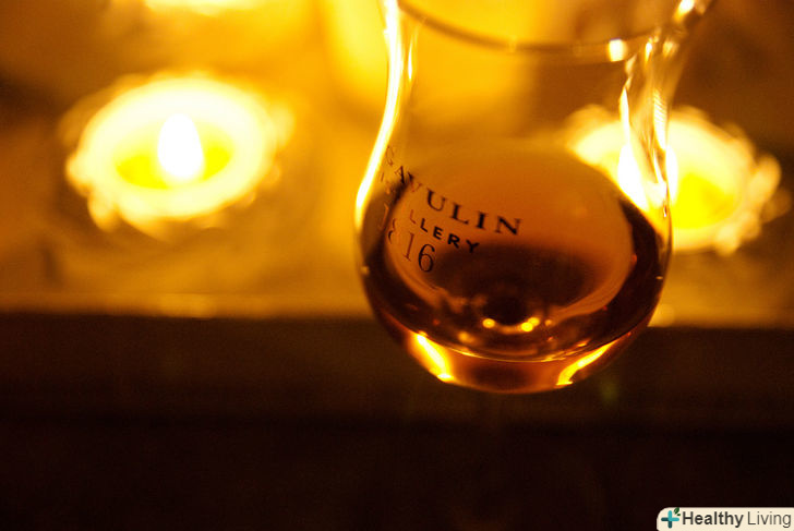 Додайте невелику кількість води в віскі.багато шанувальників віскі люблять додавати воду в напій в кількості, достатній для того, щоб розбавити міцність алкоголю до 30%%.[11] зазвичай це менше чайної ложки. Деякі віскі вимагатимуть більше води, деякі-менше; як і з більшістю тонких речей, тут краще менше, чим більше.- Ось порада з приводу того, скільки води необхідно додати в віскі. Додавайте по кілька крапель води за раз до тих пір, поки печіння в носі, що виникає під час вдихання аромату віскі, не зникне.