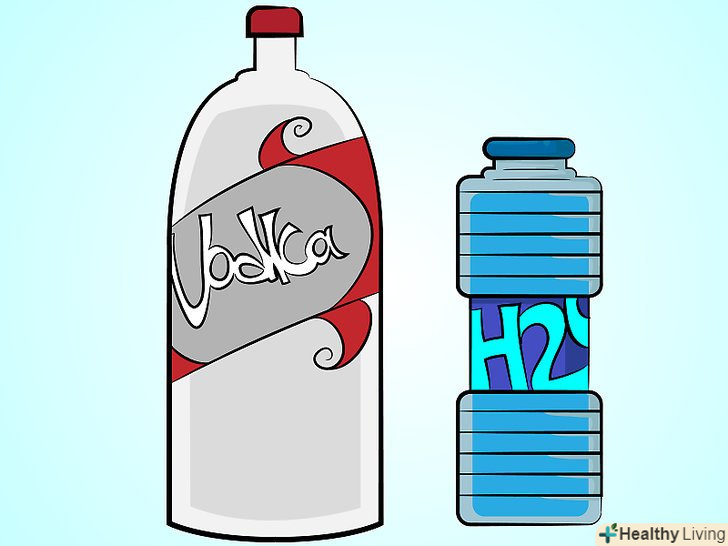 Підтримуйте водний баланс. Пийте багато води, коли приймаєте спиртне. Це не тільки запобіжить похмілля, але і допоможе приховати запах алкоголю.- Намагайтеся випивати один стакан води (250 мл) на кожну порцію алкогольного напою. Одну порцію складають 250 мл пива, 100 мл вина або ж одна чарка міцного алкоголю.