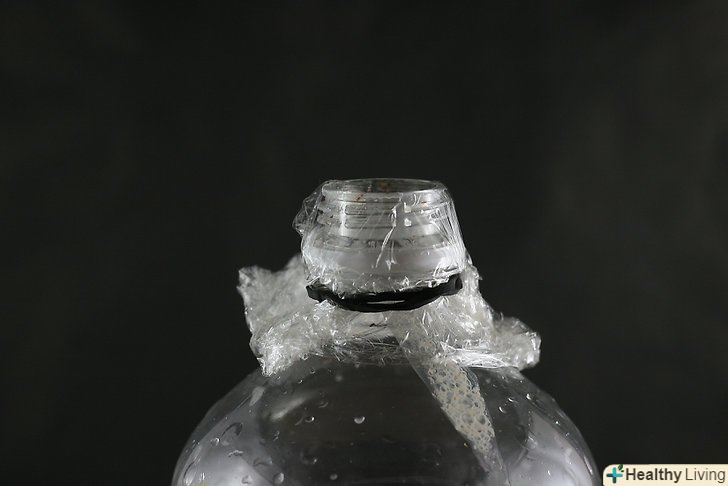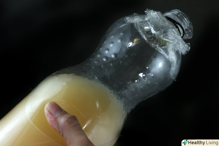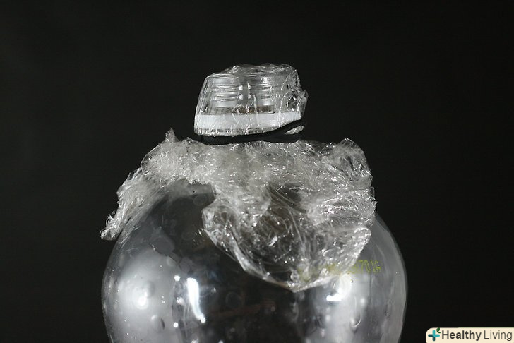 Додайте свій 'простий ЗАМОК': замість того, щоб використовувати непотрібний замок / обладнання, зробіть 'простий замок' для відведення газів від ферментації. Це легко зробити з пластикової плівки і гумки. Вільно накрийте верхню частину вашої пляшки пластиковою плівкою і розтягніть гумку навколо горлечка, щоб зафіксувати на місці. Переконайтеся, що кришка з пластикової плівки достатньо вільна, щоб дозволити газам виходити (в цьому СЕКРЕТ).