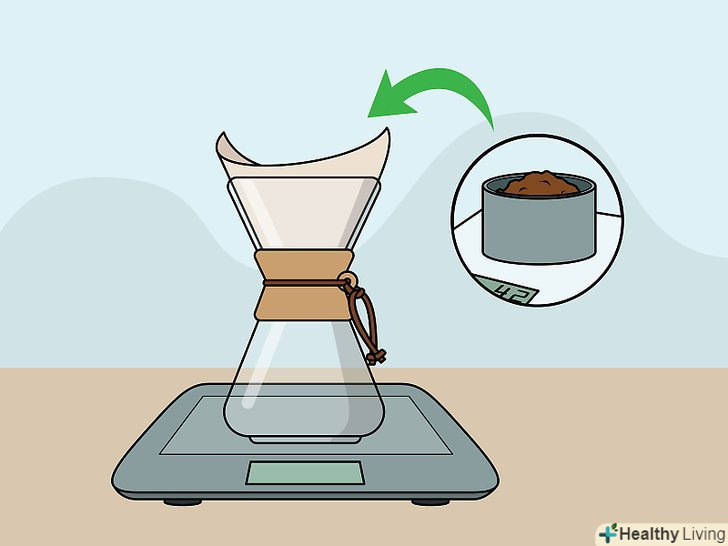 Підготуйте Chemex.покладіть подрібнені кавові зерна в заздалегідь змочений фільтр, який Ви розмістили зверху на кавоварці Chemex.[10] встановіть кавоварку Chemex на цифрові ваги. Також приготуйте таймер або годинник перед тим, як почати готувати каву.- Переконайтеся, що шкала ваг виставлена на нуль після того, коли поставите кавоварку Chemex на ваги. Це допоможе вам точно відміряти кількість води.