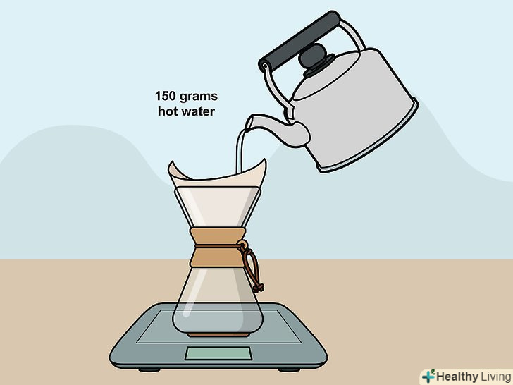 Зачекайте і налийте воду поверх зерен.коли кавові зерна наситяться водою, почекайте 45 секунд. Повільно налийте на кавові зерна близько 2,5 склянок (450 гр) води. Кавоварку Chemex необхідно заповнити майже до верху.[12]- Наливайте воду на зерна круговими або звивистими рухами-це допоможе краще змішати кавові зерна з водою.