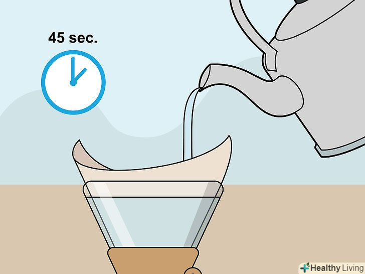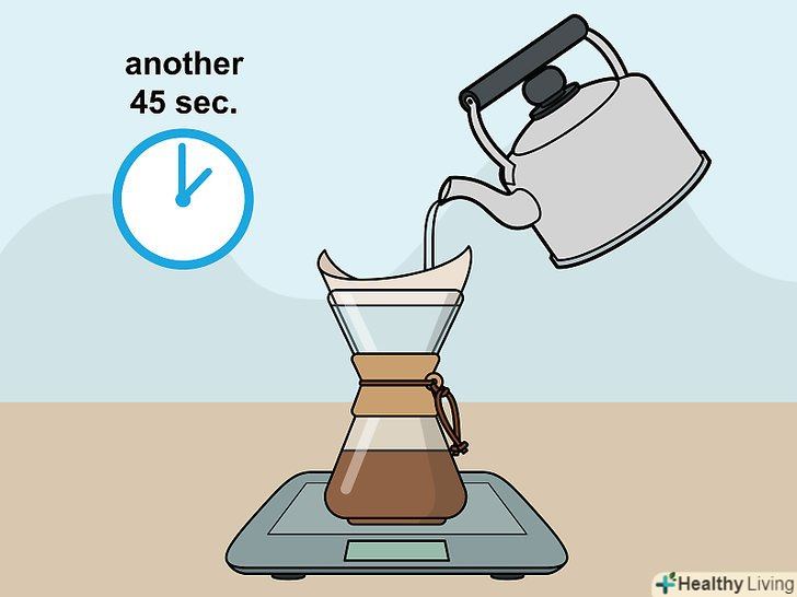 Зачекайте і додайте ще води.зачекайте ще 45 секунд, поки кава повільно фільтрується через Chemex. Цим ви дасте йому ще краще заваритися. Додайте ще води. Повільно і обережно налийте достатню кількість води, щоб майже повністю заповнити фільтр і закрити кавові зерна.[13]- Рівень води за шкалою повинен бути близький до 700 грамам.