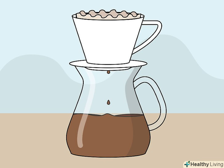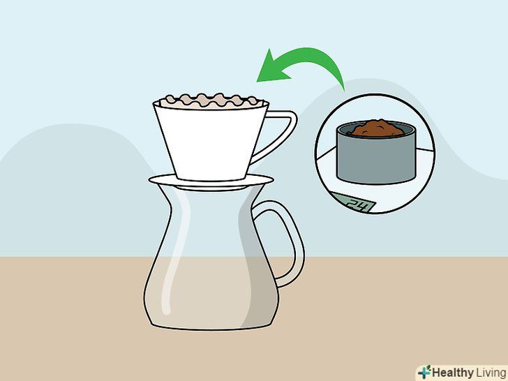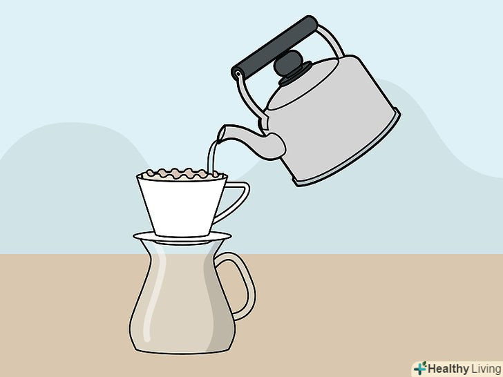 Нагрійте пуровер-кавоварку і фільтр.згорніть паперовий фільтр і розмістіть його поверх вашої пуровер-кавоварки. Налийте невелику кількість гарячої води поверх фільтра, щоб він повністю просочився водою. Акуратно злийте зайву воду.[17]- Існує безліч різних пуровер-кавоварок різних виробників, включаючи Kalita, Bee House, Clever Dripper і Hario V60. Більшість з них являють собою кухоль, над якою знаходиться воронка. У воронку вставляється паперовий фільтр і через неї кава стікає в кухоль.