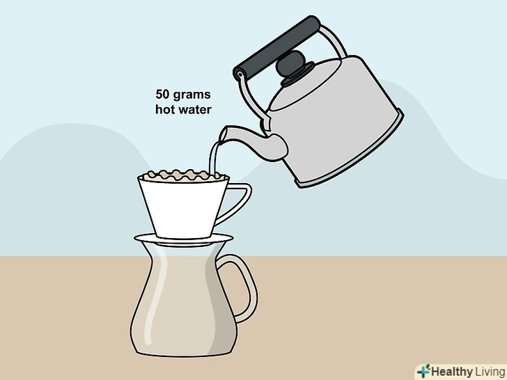 Дайте зернам насититися водою.запустіть таймер або подивіться на годинник, щоб засікти час заварювання кави. Повільно налийте на кавові зерна, що лежать у фільтрі, близько 1/4 склянки (або 50 гр) гарячої води. Акуратно перемішайте зерна з водою за допомогою ложки або палички.- Завдяки перемішуванню кавові зерна зможуть краще просочитися водою.[20]