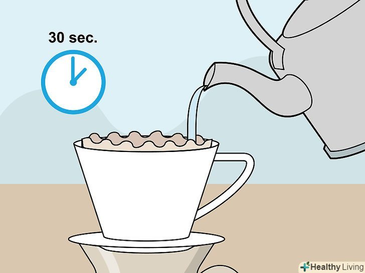 Зачекайте і залийте зерна водою.коли кавові зерна наситяться водою, почекайте 30 секунд. Це дозволить кавовим зернам розкрити свій аромат. Повільно і обережно налийте на зерна ще води, наповнивши фільтр водою до середини.[21]- Наливайте воду на зерна круговими або звивистими рухами-це допоможе краще змішати кавові зерна з водою.