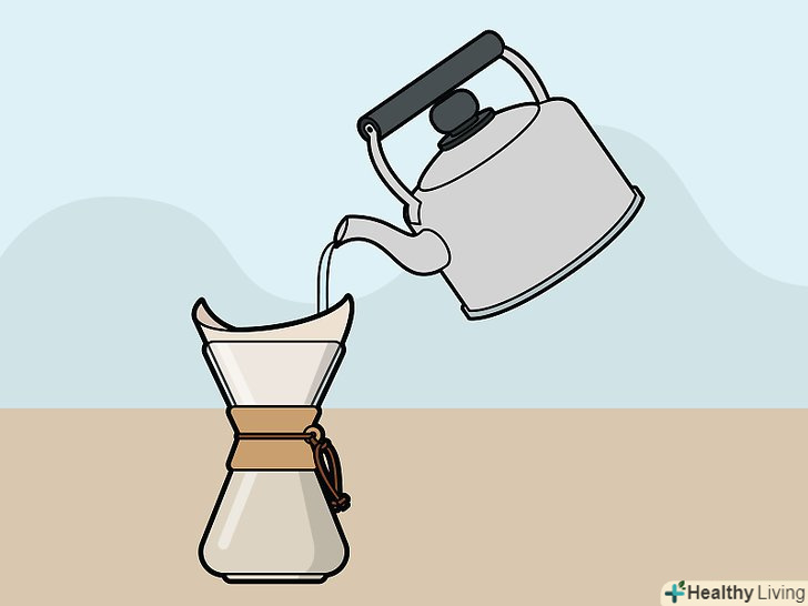 Нагрійте Chemex і фільтр.згорніть спеціальний паперовий фільтр для кавоварки Chemex так, щоб вийшов конус. Встановіть фільтр у верхній частині кавоварки. Налийте на фільтр трохи води, щоб він розмочився. Акуратно злийте і приберіть рідину.- Цим Ви зможете прибрати повітряні бульбашки між фільтром і кавоваркою Chemex, а також позбутися від присмаку паперу. Крім цього, ви нагрієте сам чайник, і Ваша Кава не буде холодною.[8]