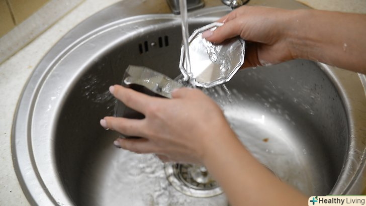 Помийте кавоварку водою і без миючих засобів.вилийте каву з кавоварки і дайте їй повністю охолонути, перш ніж приступати до її очищення. Розберіть кавоварку і ретельно промийте кожну частину під прохолодною водою. Протріть кожну частину кухонним рушником.[18]- Якщо ви помітите кавовий осад, витріть його сухим паперовим рушником.