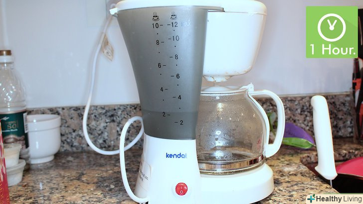 Залиште кавоварку постояти одну годину.Встановіть таймер на годину. Залиште кавоварку просто стояти протягом цього часу.[6] Так у оцту буде час подіяти і очистити прилад від можливої цвілі.- Завершіть цикл заварювання.після того, як кавоварка постоїть одну годину, знову включіть прилад. Дозвольте йому завершити цикл заварювання. Коли все буде готово, весь відфільтрований Водний розчин оцту повинен виявитися в ємності для кави. Його можна просто злити в раковину.[7]