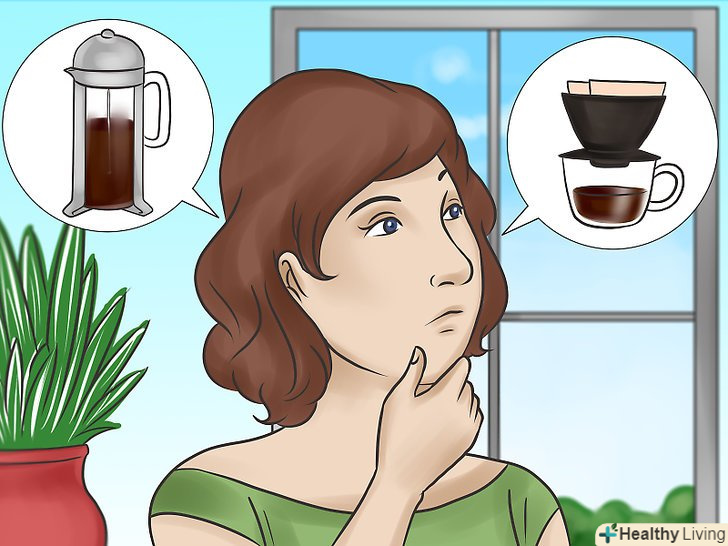 Визначитеся з тим, яким способом ви будете заварювати каву.Один з кращих способів заварити каву полягає у використанні френч-преса або пуровера. Ці кавоварки не дають кави затримуватися у верхній частині пальника на тривалий час, і таким чином аромат напою зберігається, а кава не згорає.[9]- Купіть невеликий френч-прес, щоб спробувати різні способи приготування. З цієї кавоварки можна отримати трохи більше восьми 220 мілілітрів кави.