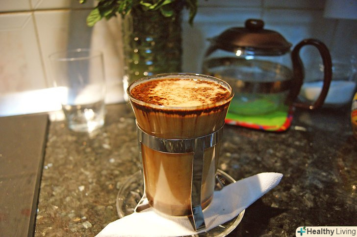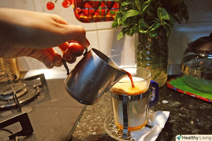 Нагрійте молоко.вилийте в металеву кухоль ¾ склянки молока або використовуйте каструлю для духовки. Помістіть термометр в кухоль. Доведіть молоко до 75 ºС (нагрійте майже до кипіння).- Парова трубка повинна бути встановлена по діагоналі, трохи нижче поверхні молока. Це допоможе сформувати "піну", необхідну для гарного карамельного маккіато.