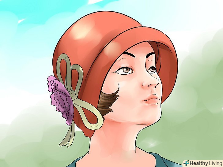 Підберіть капелюшок або інший головний убір.якщо ви віддаєте перевагу пов'язці справжній головний убір, зробіть вибір на користь однієї з класичних моделей – клош, тюрбан або шапочка з бісеру.- Найвідоміший фасон капелюшків того часу-клош, або капелюшок-дзвін ("cloche "означає" Дзвін " по-французьки), щільно облягає голову. Ви можете знайти такі капелюшки у продавців в інтернеті або в магазинах карнавальних костюмів.[8]