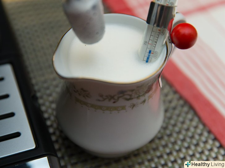 Піднесіть молоко під стимер.піднесіть глечик так, щоб стимер був трохи занурений в молоко.[1]- Стимер необхідно занурити в молоко під кутом 15 градусів.