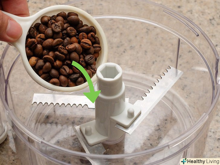 Використовуйте кухонний комбайн.відміряйте необхідну кількість зерен і засипте в кухонний комбайн. Подрібніть зерна п'ятисекундними імпульсами протягом 10-20 секунд. Не забувайте стежити за рівномірністю помелу і продовжуйте подрібнювати зерна короткочасними імпульсами до бажаного стану.[2]- Розберіть і промийте кухонний комбайн, щоб позбутися від запаху кави.