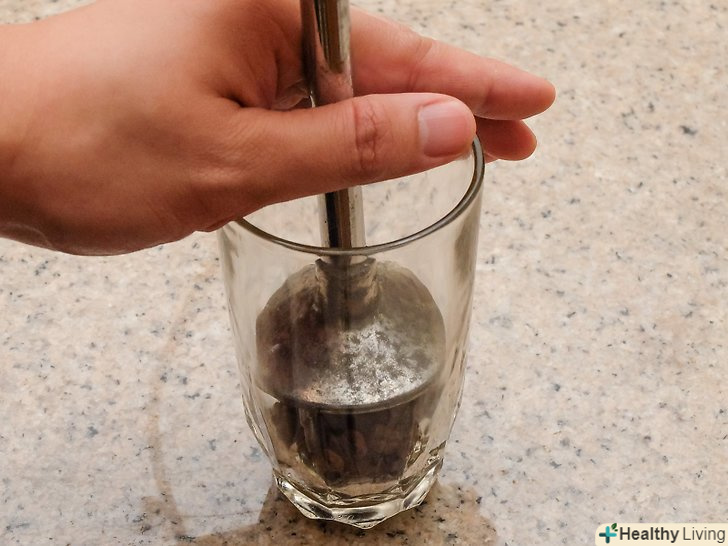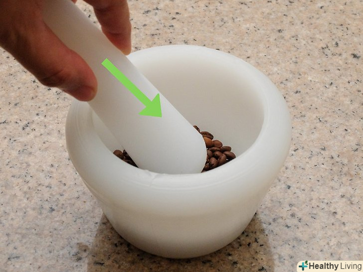Використовуйте товкач і ступку.насипте в ступку 1-2 столових ложки (5-10 грамів) кавових зерен. Прикрийте верх ступки однією рукою, щоб зерна не вистрибували назовні. Другою рукою візьміть товкач і розімніть зерна по стінках. Через п'ять секунд витягніть товкач, а потім поставте у вертикальне положення, щоб розбити зерна.[4]- Продовжуйте розминати і розбивати зерна, поки не отримаєте бажаний помел.