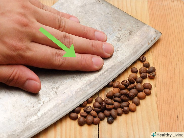 Роздушіть зерна.помістіть кавові зерна на велику обробну дошку. Візьміть великий ніж для оброблення м'яса і покладіть плоскою стороною на зерна. Помістіть поверх ножа розкриту долоню і натисніть. Коли зерна розколються, обережно посуньте ніж ближче до себе. Продовжуйте тиснути на Ніж, щоб сильніше подрібнити зерна.[5]- Такий спосіб дозволяє отримати середній або середній тонкий помел.