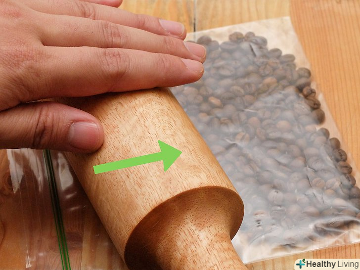 Подрібніть зерна качалкою.відміряйте необхідну кількість зерен і засипте в щільний пакет для заморозки. Закрийте пакет і помістіть на плоску поверхню. Розправте зерна, щоб вони лягли одним шаром. Акуратно постукайте по зернах качалкою, щоб розбити їх, а потім працюйте качалкою як зазвичай, щоб отримати бажаний помел.[6]- Якщо у вас немає щільного пакета, то можна перекласти зерна листами пергаментного паперу.