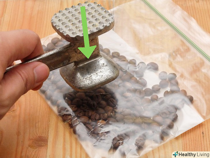 Розбийте зерна молотком.помістіть кавові зерна між двома шарами пергаментного паперу або в герметичний пакет для заморозки. Покладіть пакет поверх рушника на плоску поверхню і розрівняйте зерна одним шаром. Подрібніть їх рівномірними ударами середньої сили. Подрібнюйте до тих пір, поки не отримаєте великий або середній помел.- Можна використовувати звичайний, кухонний відбивний молоток або киянку.[7]