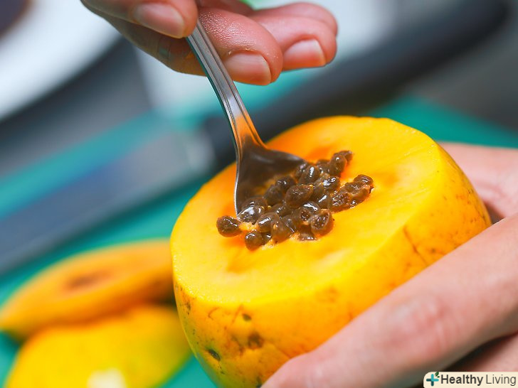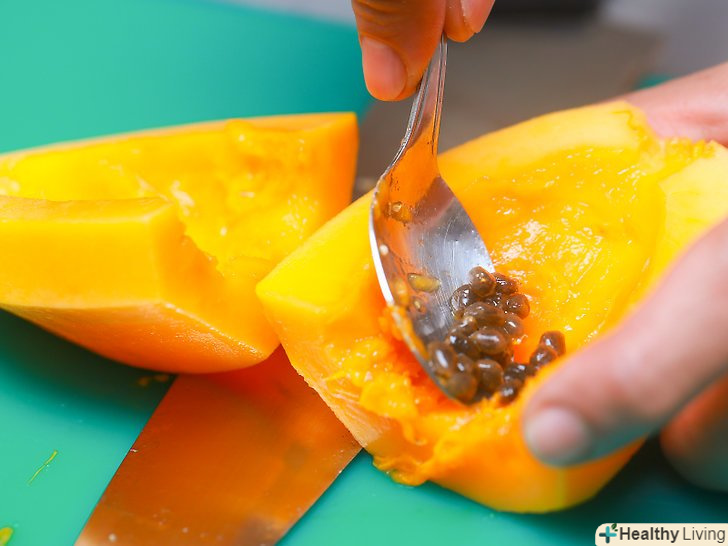 Приберіть всі залишилися насіння і волокна.вивчіть кожну половину папайї, щоб виявити всі пазухи з насінням. За допомогою ложки дістаньте залишилися насіння. Приберіть всі білі волокна, щоб консистенція коктейлю вийшла однорідною.[3]
