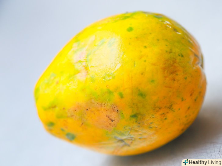 Використовуйте тільки стиглу папайю.перш ніж використовувати фрукт для приготування коктейлю, переконайтеся, що він досить стиглий. Існує три простих способи з'ясувати, чи дозріла папайя, не розрізаючи її при цьому:- Подивіться на колір. Шкірка незрілої папайї зеленого кольору. Поверхня ж стиглого фрукта рясніє різноманітністю червоних, помаранчевих і жовтих відтінків. Деякі сорти папайї жовтіють, коли дозрівають, а інші стають червоними; головне, щоб плід не був зеленого кольору.