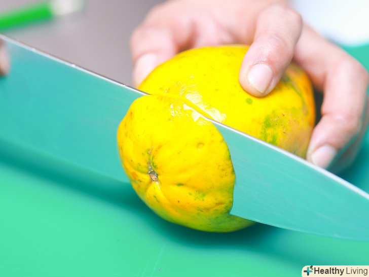 Відкрийте фрукт. Відріжте верхню частину плоду біля стебла. Розріжте папайю уздовж на дві частини.