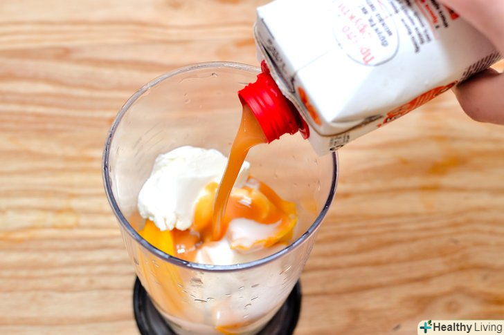 Змішайте всі інгредієнти в блендері.покладіть фрукти, йогурт і сік в блендер. Змішуйте інгредієнти, поки вони повністю не перемішаються. Додайте більше соку, якщо ви хочете зробити смузі більш рідким, або додайте йогурту, якщо хочете зробити смузі більш густим.
