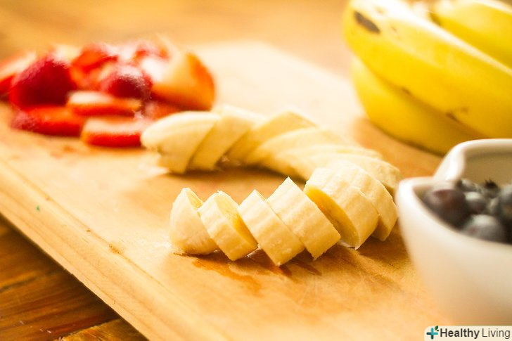 Наріжте банани і полуницю при необхідності.наріжте банан шматочками середнього розміру. Видаліть у суниці листочки і наріжте її, якщо ягоди великі. Не потрібно нарізати все акуратно, адже все одно все це буде пюріровано в блендері.