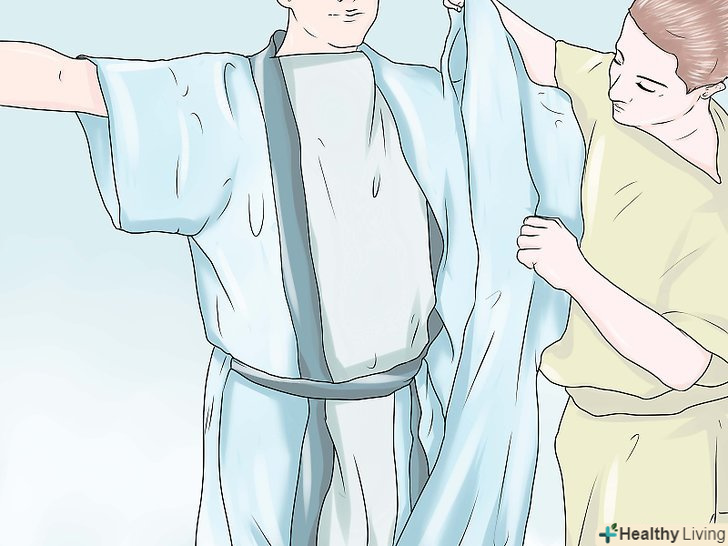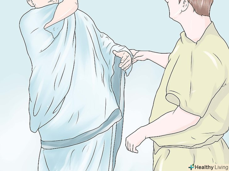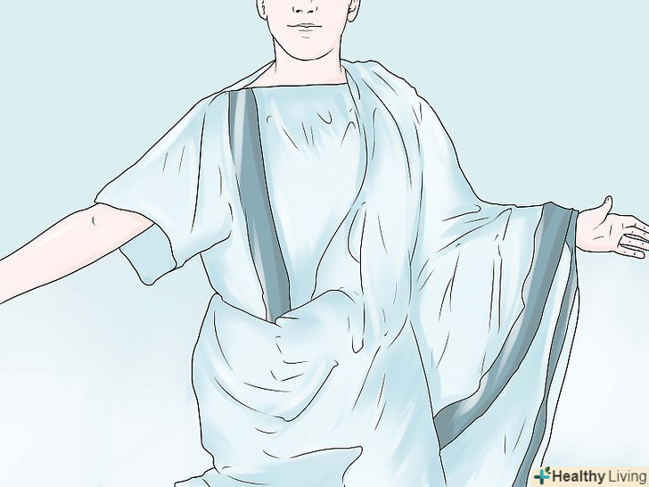 Витягніть ліву руку в сторону.задрапіруйте лівий кінець тоги навколо руки так, щоб він звисав спереду приблизно до щиколотки. (Дивіться приблизно до 25-ої секунди на відео).