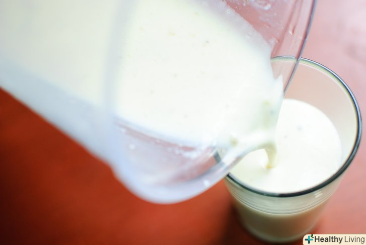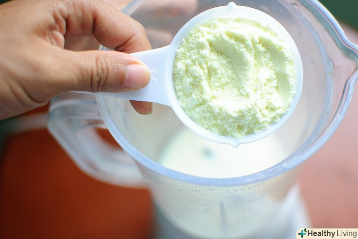 Додайте ложку суміші сироваткового протеїну, який можете купити в інтернет-магазині або супермаркеті, закрийте блендер кришкою, потім змішайте молоко і протеїн на середній швидкості протягом 15 секунд.