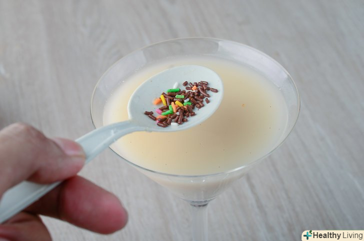 Щоб зробити святковий молочний коктейль на день народження, додайте в нього півсклянки (60 грам) суміші для ванільного кексу, а зверху прикрасьте посипкою для торта.просто додайте суміш до решти інгредієнтів і змішуйте до тих пір, поки не отримаєте чудово солодкий варіант класичного ванільного коктейлю. Прикрасьте кондитерської посипкою.[12]
