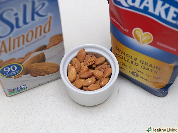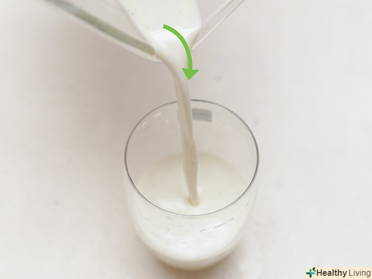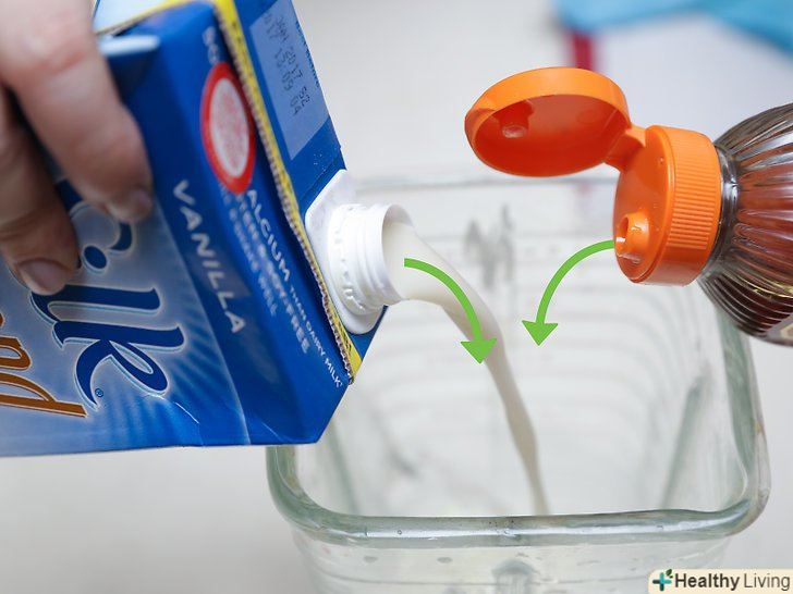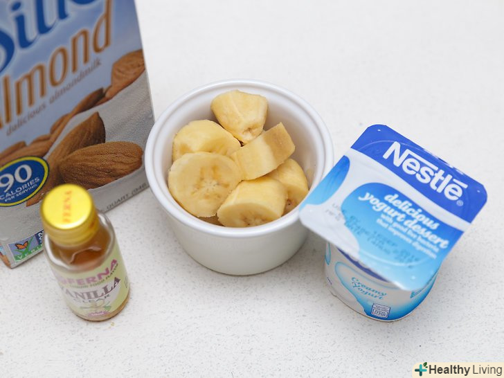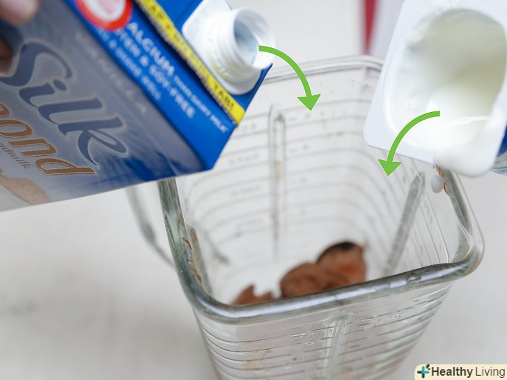 Залийте мигдальне молоко в блендер.залежно від особистих уподобань, можна використовувати звичайне, ванільне або шоколадне мигдальне молоко. Щоб коктейль вийшов більш корисним, зупиніть вибір на непідсолодженому мигдальному молоці і Покладіться на інші інгредієнти, які додадуть йому солодкість.- Якщо ви хочете приготувати смузі з мигдального молока, а не просто коктейль, включіть в рецепт 240 мл знежиреного йогурту. При цьому скоротіть кількість мигдалевого молока до ¾ склянки (180 мл). Щоб смузі вийшов безлактозним, використовуйте мигдальний, соєвий або кокосовий йогурт.