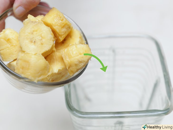Наріжте шматочками 2 банани середнього розміру і додайте їх в блендер.якщо ви не любите банани, від них можна відмовитися або замінити на інші фрукти, наприклад, на манго. Банан служить для додання коктейлю більш густої консистенції і насиченого смаку.- Щоб отримати густий смузі, використовуйте в рецепті заморожені банани.