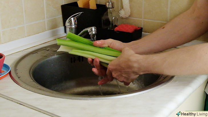 Ретельно промийте кожне стебло селери.відкрийте кран і, тримаючи стебло під проточною водою, ретельно потріть поверхню стебла пальцями, щоб видалити залишки грунту та інші забруднення. Таким же чином промийте всі інші стебла.[2]- Якщо у вас є великий друшляк, покладіть в нього стебла селери і помістіть під проточну воду — це дозволить вам вимити всі черешки одночасно.