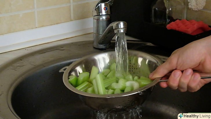 Покладіть нарізані стебла селери в друшляк і ретельно промийте.покладіть нарізану селеру в друшляк і помістіть під проточну воду. Ретельно перемішайте шматочки рукою, щоб змити з них залишки грунту та інші забруднення.[6]- Особливо важливо ретельно промити стебла, якщо ви використовуєте для приготування соку звичайний селера, а не овочі, вирощені із застосуванням методів органічного землеробства. Вам потрібно змити з поверхні черешків залишки пестицидів та інших хімічних речовин, які використовувалися при вирощуванні селери. По можливості використовуйте для приготування соку селера, вирощений органічними способами.
