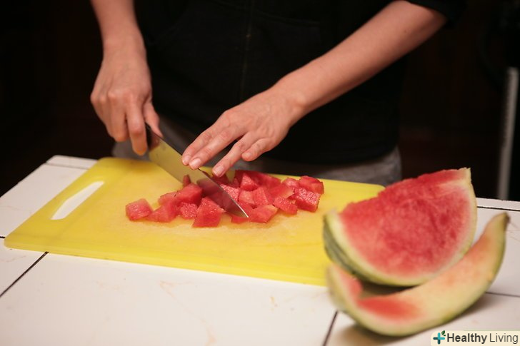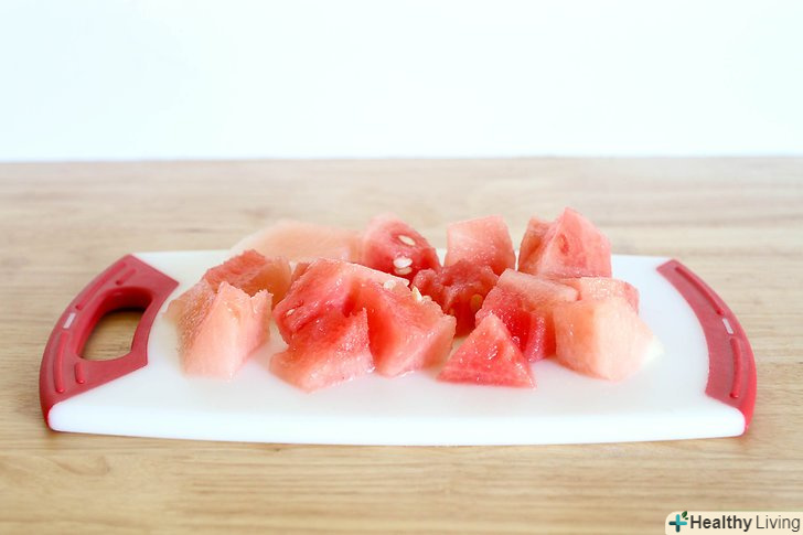 Покладіть кавун на обробну дошку.почистіть кавун і наріжте його на шматочки товщиною 2,5 см за допомогою гострого ножа.