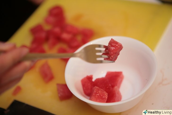 - Якщо вам не знайти кавун без кісточок, купіть звичайний кавун, наріжте його на четвертинки. Знайдіть лінію насіння, розріжте кавун уздовж цієї лінії. За допомогою вилки видаліть кісточки, що прилипли до кавуна.
