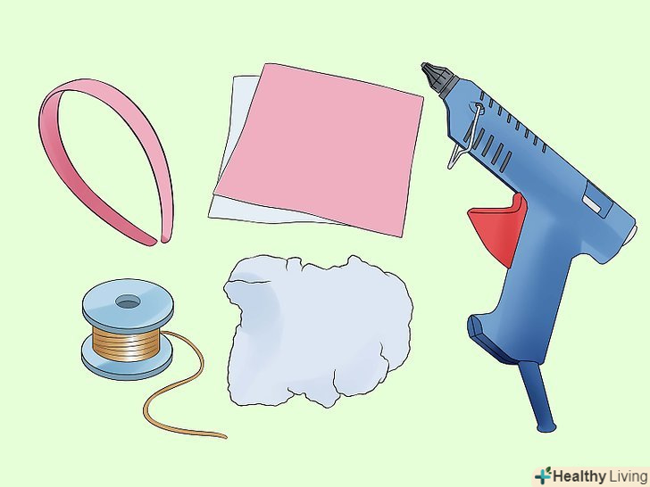 Зберіть всі матеріали.доповніть костюм рогом і вухами. Для цього вам знадобляться головна пов'язка, повсть (білий і рожевий), бавовна, товсті золоті нитки і пістолет для склеювання. Ці матеріали ви можете знайти в магазинах тканини.- Ви також можете використовувати стрічку або гумку в якості пов'язки на голову, незважаючи на те, що вони можуть погано триматися на голові.[6]