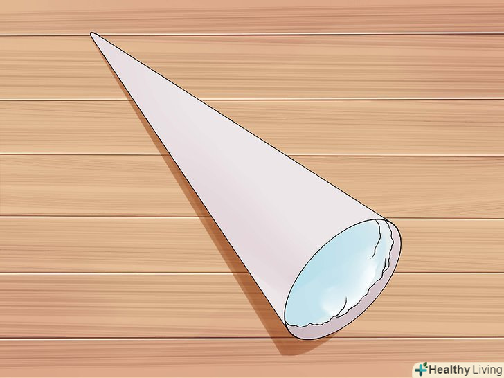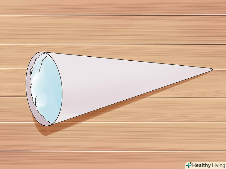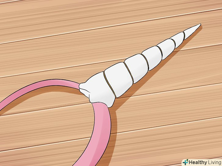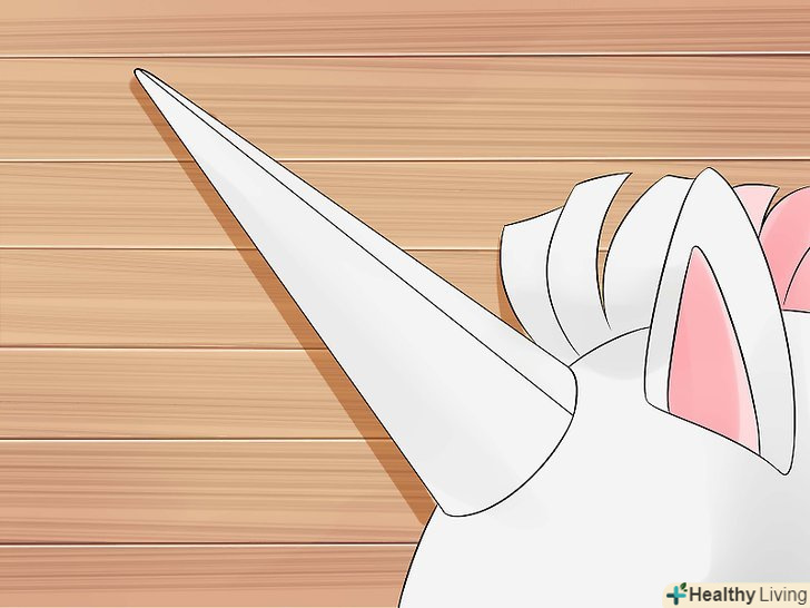 Зробіть Ріг. Виріжте великий трикутник з білого повсті. Трикутник повинен бути приблизно тієї ж висоти, що і головна пов'язка, а нижній кінець трикутника повинна бути діаметром в 2-3 см.- Розкачайте повсть в конічну форму. Використовуйте пістолет для склеювання, щоб склеїти Ріг.[7] ви також можете зшити Ріг у вигляді кона.