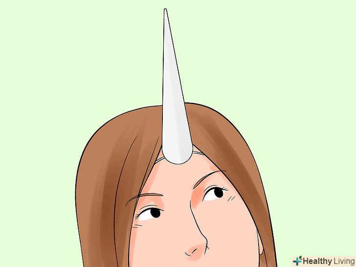 Зробити ріг єдинорога.згорніть аркуш паперу в конус. Обріжте дно конуса так, щоб він добре сидів на вашій голові. Прикріпіть стрічку або гумку до нижньої частини Рогу. Прикріпіть Ріг до голови.[9]- Прикрасьте Ріг маркерами, олівцями, блиском або наклейками.