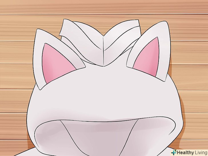 Пришийте вуха до балахону.помістіть вуха по краях гриви на кілька см глибше переднього краю капюшона. Прикріпіть їх шпильками. Приміряйте балахон, щоб переконатися, що встановили їх правильно. Зшийте нитками і голкою, або прикріпіть шпильками з внутрішньої сторони капюшона.
