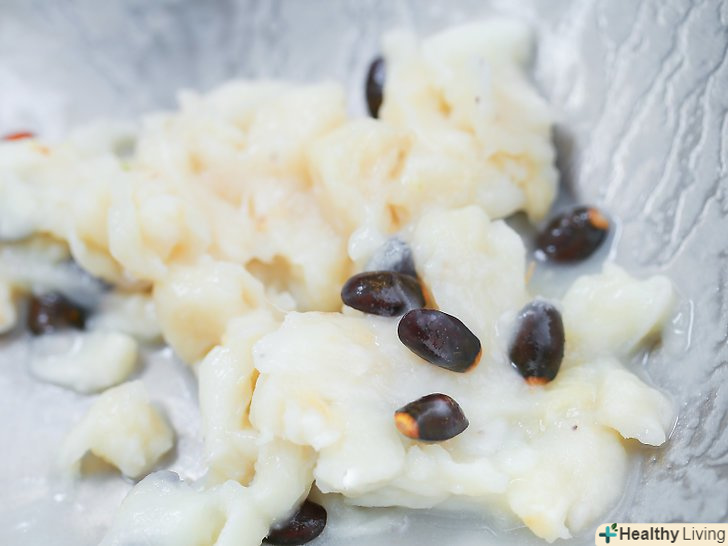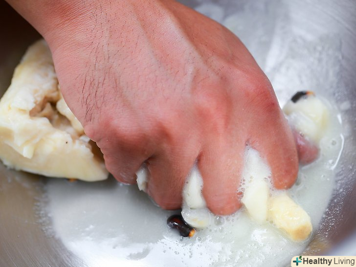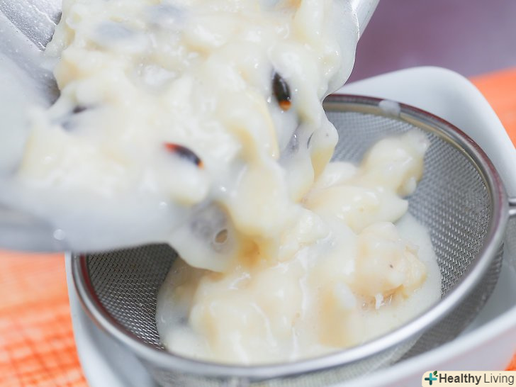 Вичавіть плід руками.М'якоть дуже ніжна, тому вам не будуть потрібні додаткові інструменти. Стиснення сметанного яблука вивільнить його соки, а вичавлювання соку безпосередньо у воді або молоці дозволить їм краще змішатися. В кінці процесу в ваших руках повинен залишитися великий шматок волокнистої м'якоті.