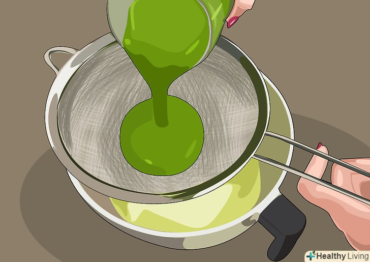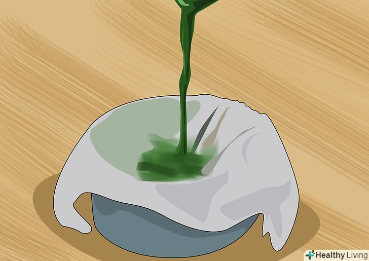 Натискайте на тканину, зливаючи сік в чистий стакан.натисніть на тканину безпосередньо там, де лежить грудка трав'яної пасти, і стискайте її рухами вниз. Повинна закапати яскраво-зелена рідина. Продовжуйте вичавлювати, поки рідина не перестане капати.