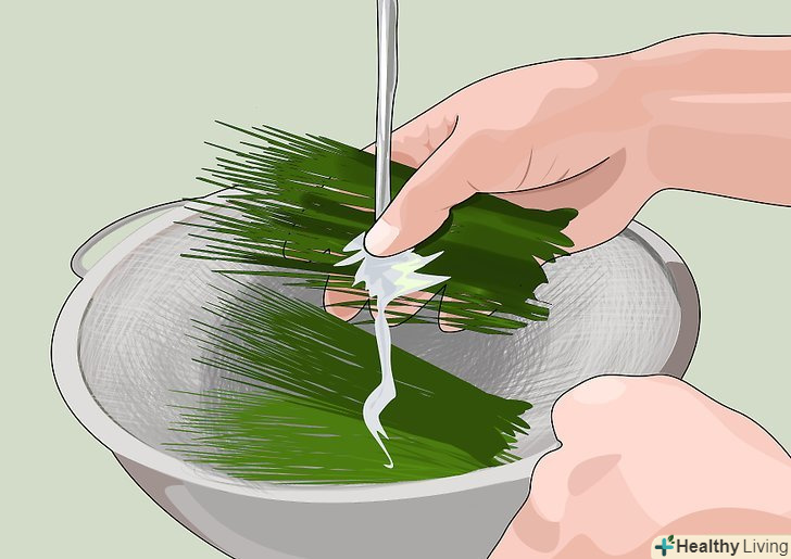 Зберіть урожай паростків пшениці, зрізуючи їх приблизно в 1,5 см на над землею. Використовуйте чистий ніж або ножиці. Паростки повинні бути приблизно 20 см у висоту — з моменту посадки насіння має пройти близько тижня. Якщо ви не вирощуєте пшеницю самостійно, пошукайте паростки в продажу в магазинах здорового харчування.[2]
